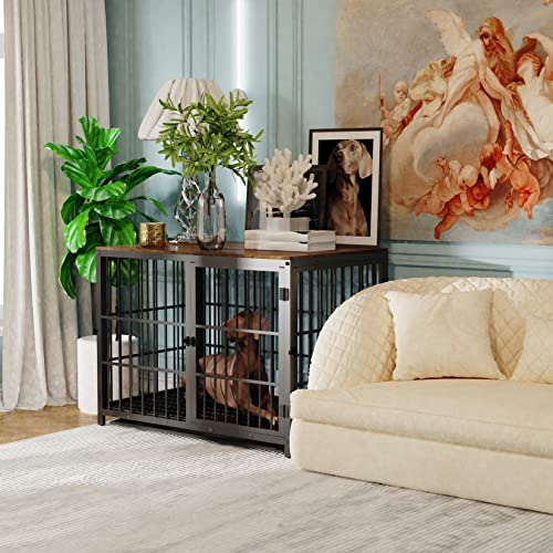 Meuble Cage Chien Bois Intérieur: Table d’Appoint, Niche Moderne pour Chiens XXL, Maison pour Animaux Grande Taille – Meuble TV avec 3 Porte et Plateau Amovible, Marron Rustique 107x71x81cm